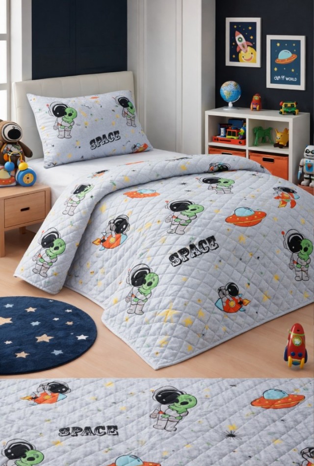 Astronot Çocuk Genç Pike Yatak Örtüsü Takımı Uzay Desen Kapitone Pamuklu 4 Mevsim | Çarşafsız 160x230