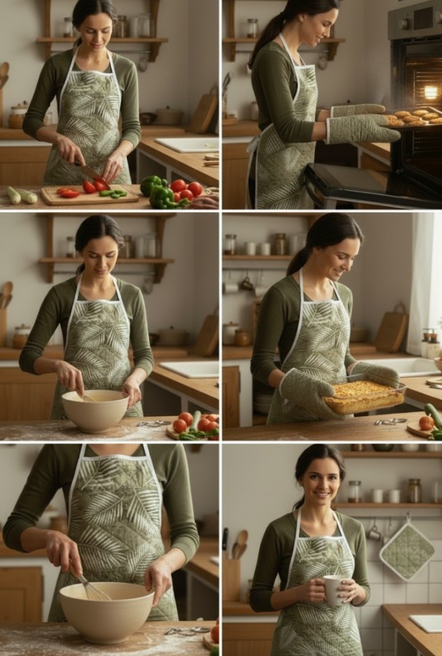 Pratik ve Kullanışlı: Önlük, eldiven ve tutaçların bir arada olması, mutfaktaki tüm ihtiyaçlarınızı karşılar.;