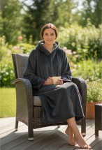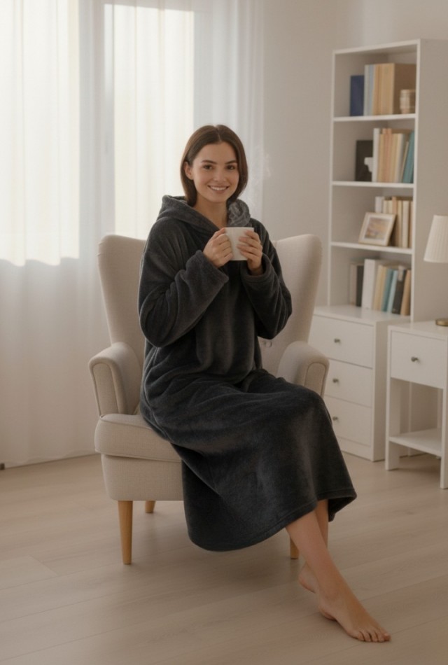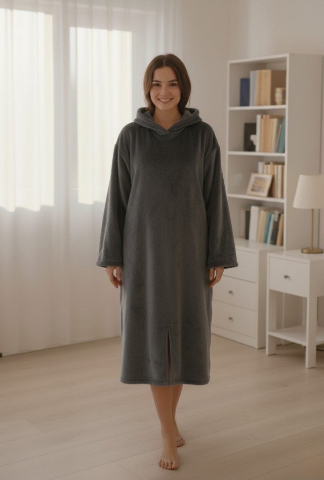 Diz altına kadar uzanan formu ve geniş kapüşonu, klasik sabahlık ve battaniyelere göre çok daha sıcak tutar.