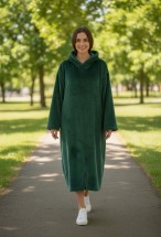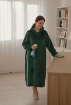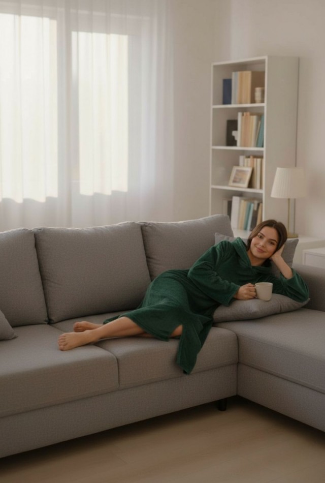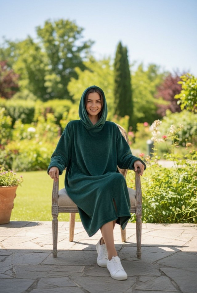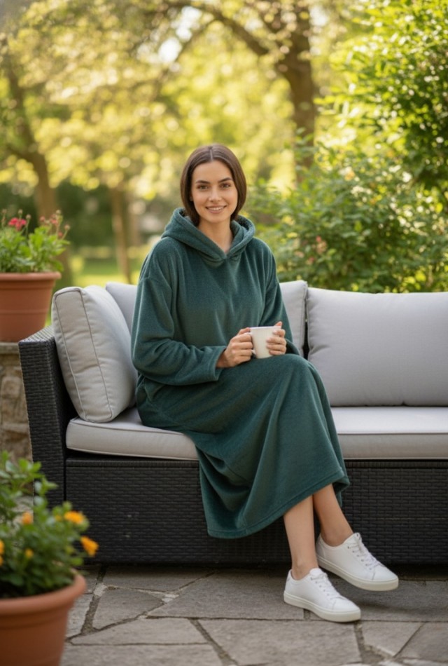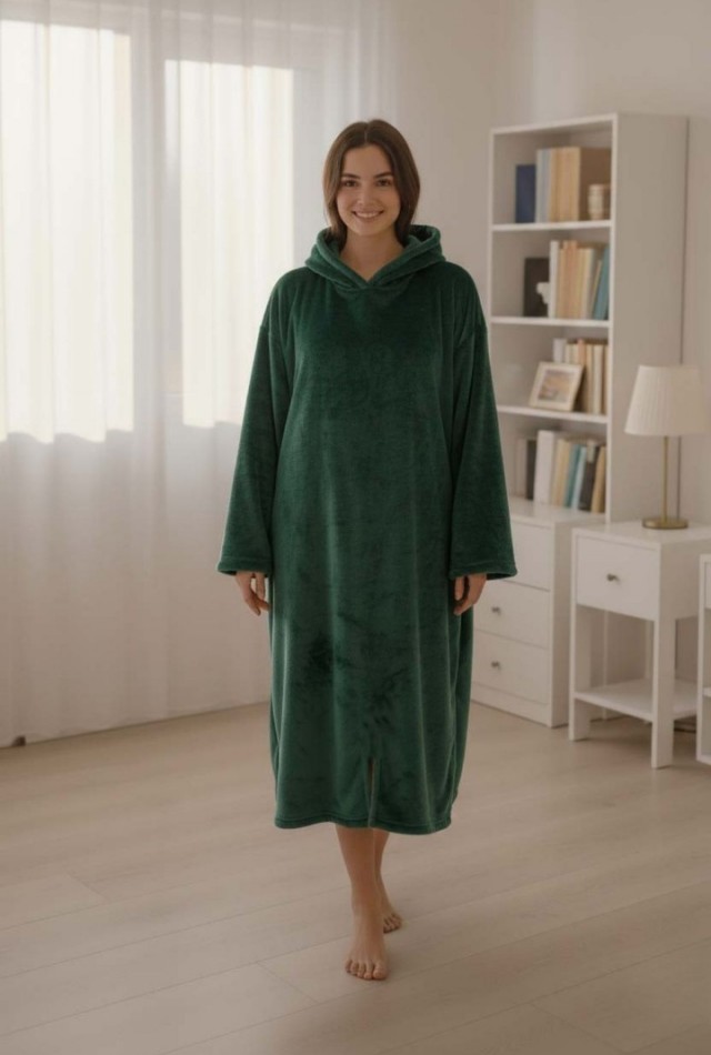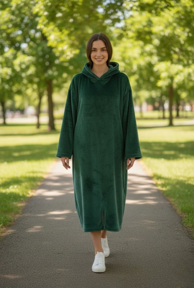 Diz altına kadar uzanan formu ve geniş kapüşonu, klasik sabahlık ve battaniyelere göre çok daha sıcak tutar.